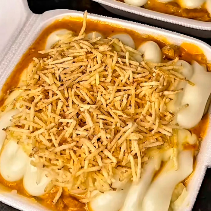 - Batata, Strogonoff de carne, requeijão, mussarela e batata palha