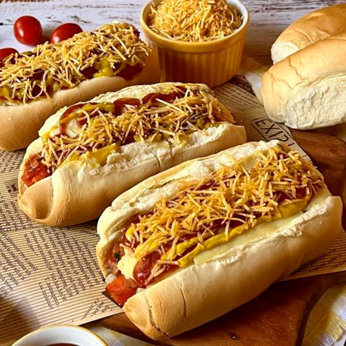 2 salsichas, purê, milho, vinagrete, batata palha e molho